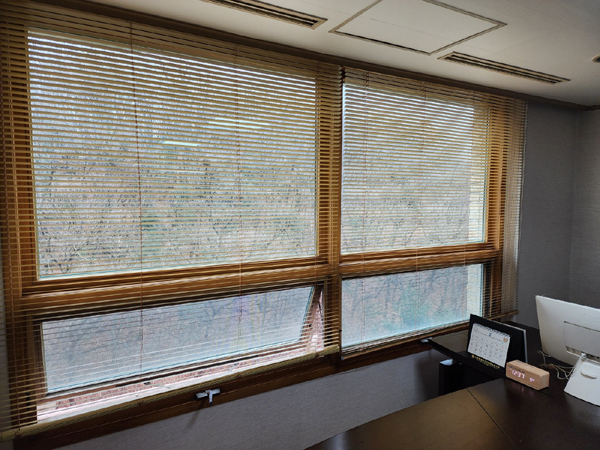 중역책상2, 중역테이블 2+회의의자, ㄱ자 책상 좌우, 피티션. 창문 블라인드 납품 및 설치하여 드렸습니다.